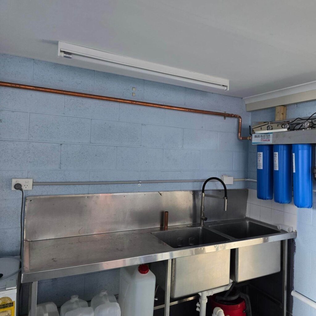 Plumber has brought in the higher pressure water connection and installed our water filters, and brought the pipes towards the back of the Distillery pending installation of other equipment that he needs to connect to.